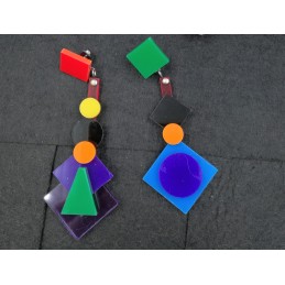 Multi squares different earrings (1 simple and 1 complex) Handmade. Dimensions: 70×25 (h x w) Material: plexiglass. PRODUCT CODE: DISS 004