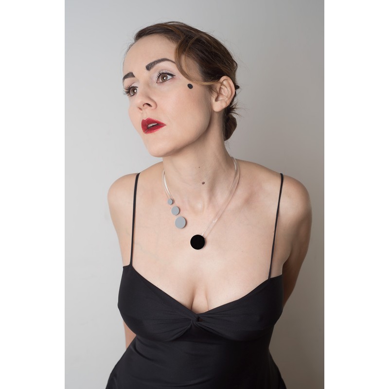 Collana con tondi di varie dimensioni e catenella in acciaio/pvcRealizzata a mano.Materiale : plexiglass e catenella in acciaio.CODICE PRODOTTO : CSL cat/pvc