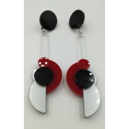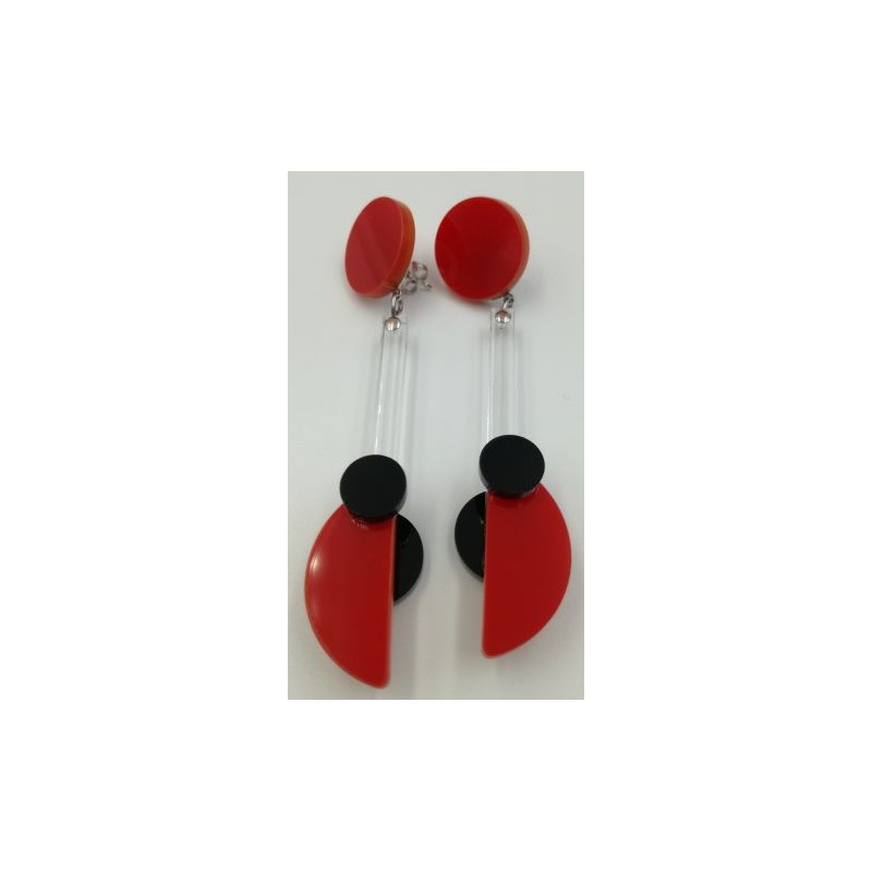 Orecchini tondo + trapezio corto.Realizzato a mano.Dimensioni: 80x10 (h x l)Materiale: plexiglass.CODICE PRODOTTO: OC/P 002